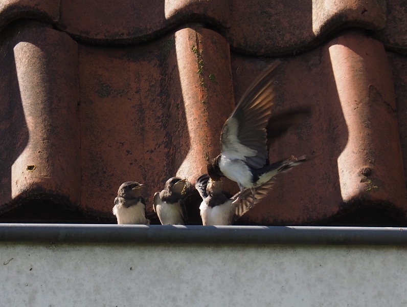Aan de wandel. De OMD gaat mee. Onderweg wil ik poging doen om de zwaluwen op de foto te krijgen. Nou, die vliegen te snel en de autofocus reageert te traag. Dat gaat hem niet worden vandaag. Bij een huis aan het eind van de weg scheren er zwaluwen over het dak. Er zit een drietal jonge zwaluwen in de dakgoot. Het is snel reageren. Ik zie amper wat ik doe. Pas bij thuiskomst kan ik de foto’s goed bekijken. En dan ontdek ik dat een jong gevoerd wordt. Wat een geluksmomentje is dat.