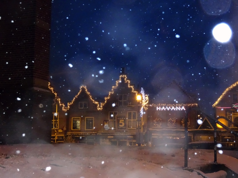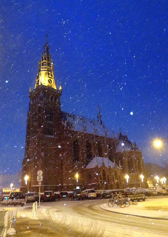 Het weerbericht voor de middag verwacht sneeuw en waarschuwt een eerder naar huis te gaan. Er vertrekken steeds meer collega’s vroeg in de middag naar huis. Ik woon op 1,5 km van mijn werk en hoef niet met de auto naar huis, dus ik werk nog even door. Rond half vijf houd ik het voor gezien en haal de camera uit de tas. Tijd voor een winterfoto. En dat valt niet mee. Geen dikke laag sneeuw, maar heel erg fijne sneeuw. Het waait ook nog eens, een uitdaging om de lens droog te houden. De vingers vriezen nog net niet aan de camera vast. Maar ik heb een sneeuwfoto. Brrrr, en nu gauw naar huis opwarmen.