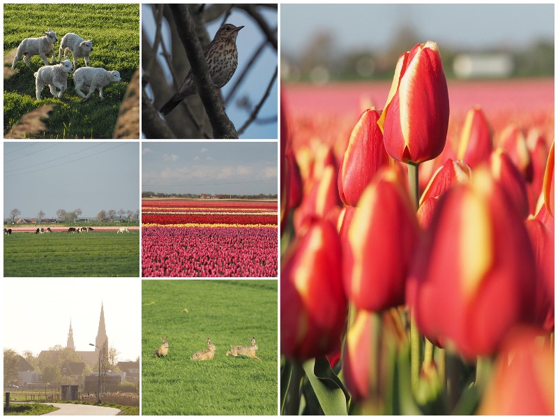 De knie protesteert nog steeds, maar met hulp van de fysiotherapeut mogen de wandelkilometers weer wat uitgebreid worden. Na het avondeten de wandelschoenen aan, de camera in de tas en even een rondje om. Ik word helemaal blij van de kleurige bollenvelden, de rennende hazen, de koeien in de wei, de kwetterende zwaluwen in de lucht, de dartelende lammetjes en met als slotstuk het concert van de zingende lijster.