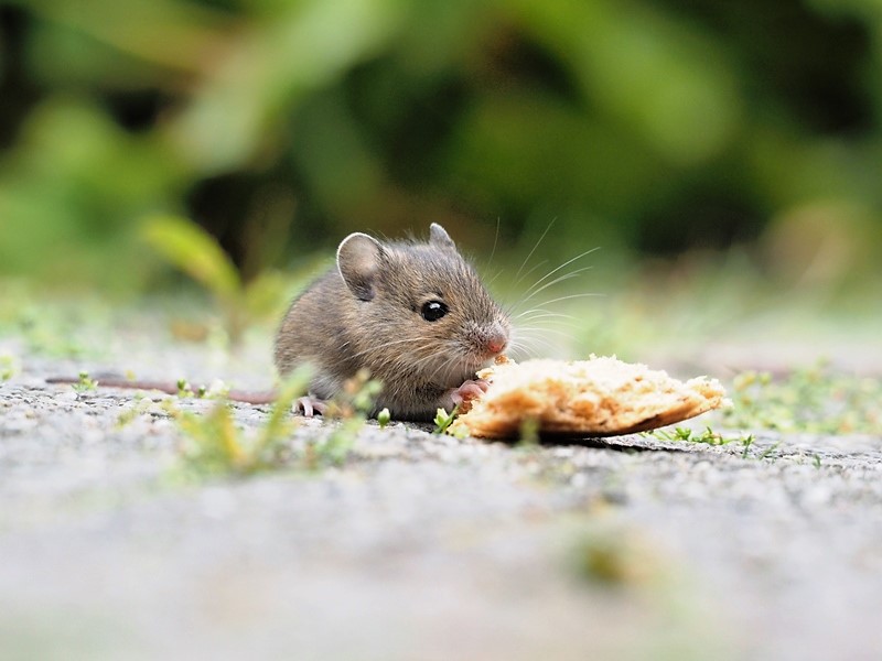 Later op de dag gooien we buiten nog wat oud brood voor de vogeltjes. En wat zien we? Jawel, er kom een muisje te voorschijn. Gelukkig, hij is niet meer in huis. De camera nu binnen handbereik. Zo’n kans krijg ik niet nog een keer. Zo stil als een muisje probeer ik dichterbij te komen. Ik kan hier wel uren naar kijken. Maar goed dat ik vandaag een vrije dag heb.