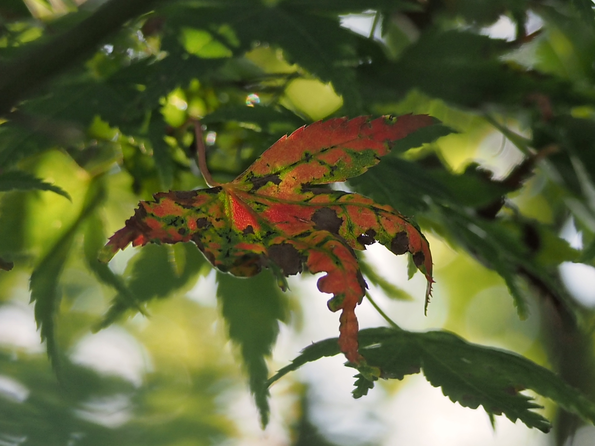 De herfst laat op zich wachten. We genieten nog even van een heerlijke nazomer. Zelfs de blaadjes aan de boom doen net of het nog geen herfst is. Groen is de kleur! Al denkt dit blaadje daar anders over. Hij kleurt vrolijk rood tussen al het groen. Benieuwd wanneer de rest volgt.