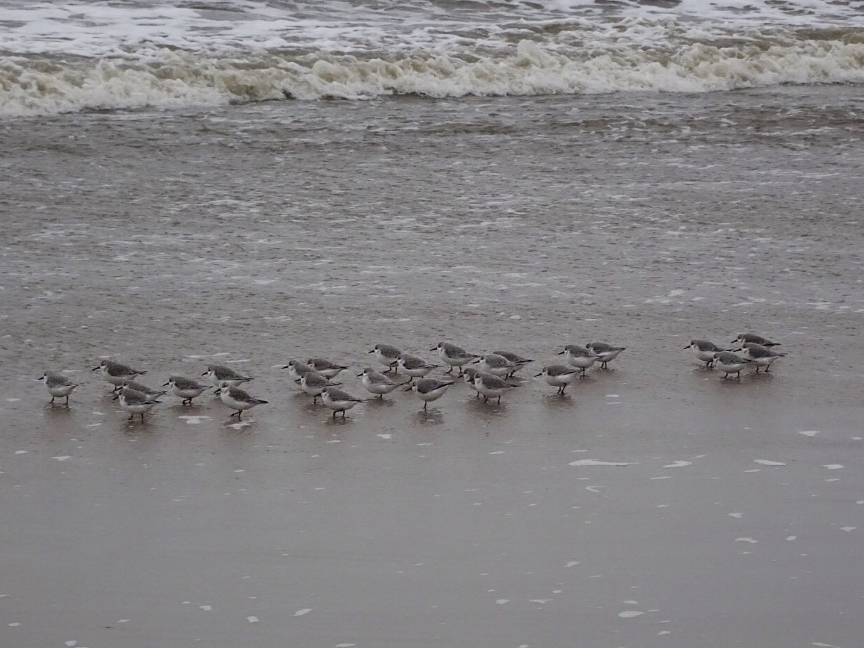 De weersvoorspellingen voor de wandelmarathon van Egmond waren niet al te best, maar het bleef zaterdag droog. Camera mee want ik wilde de strandlopertjes nu wel eens een keer goed op de foto krijgen. Ik kwam niet verder dan één foto. Een hond vond ze ook leuk, met als gevolg dat binnen een seconde de vogels gevlogen waren. Daar ging mijn droomfoto. Geen strandlopertje meer gezien. De focus maar op het wandelen gelegd, daar kwam ik tenslotte voor. Veel klimmen en dalen door rul zand. Goede oefening voor de beenspieren.