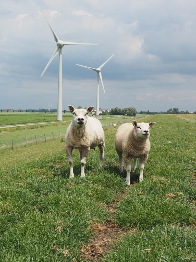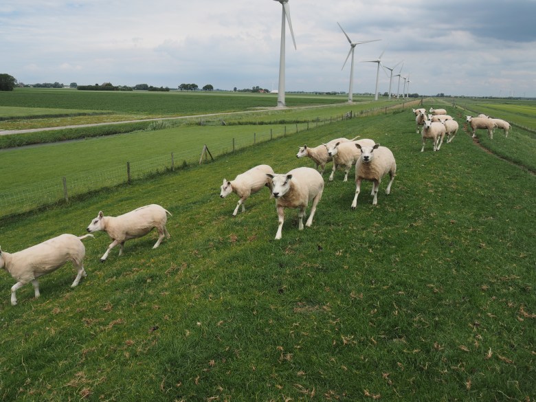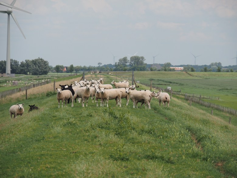 Vandaag start de route vanuit Oudesluis. Het is even zoeken naar het beginpunt. We starten direct al met een stuk(je) Noord-Holland pad. De groene dijk op. En dan sta je voor een hek met hoog gras er achter. Over het hek klimmen en dan rechtdoor? Er dwars doorheen? Eh, ja dus. Door het hoge gras naar het volgende hek. Kriebelt lekker als je een korte broek aan hebt (niet dus). Gelukkig, bij het volgende hek is het gras kort. Loopt iets makkelijker. We vervolgen onze weg verder op de Noordwesterdijk. Onder aan de dijk worden we nauwlettend in de gaten gehouden door de schapen.