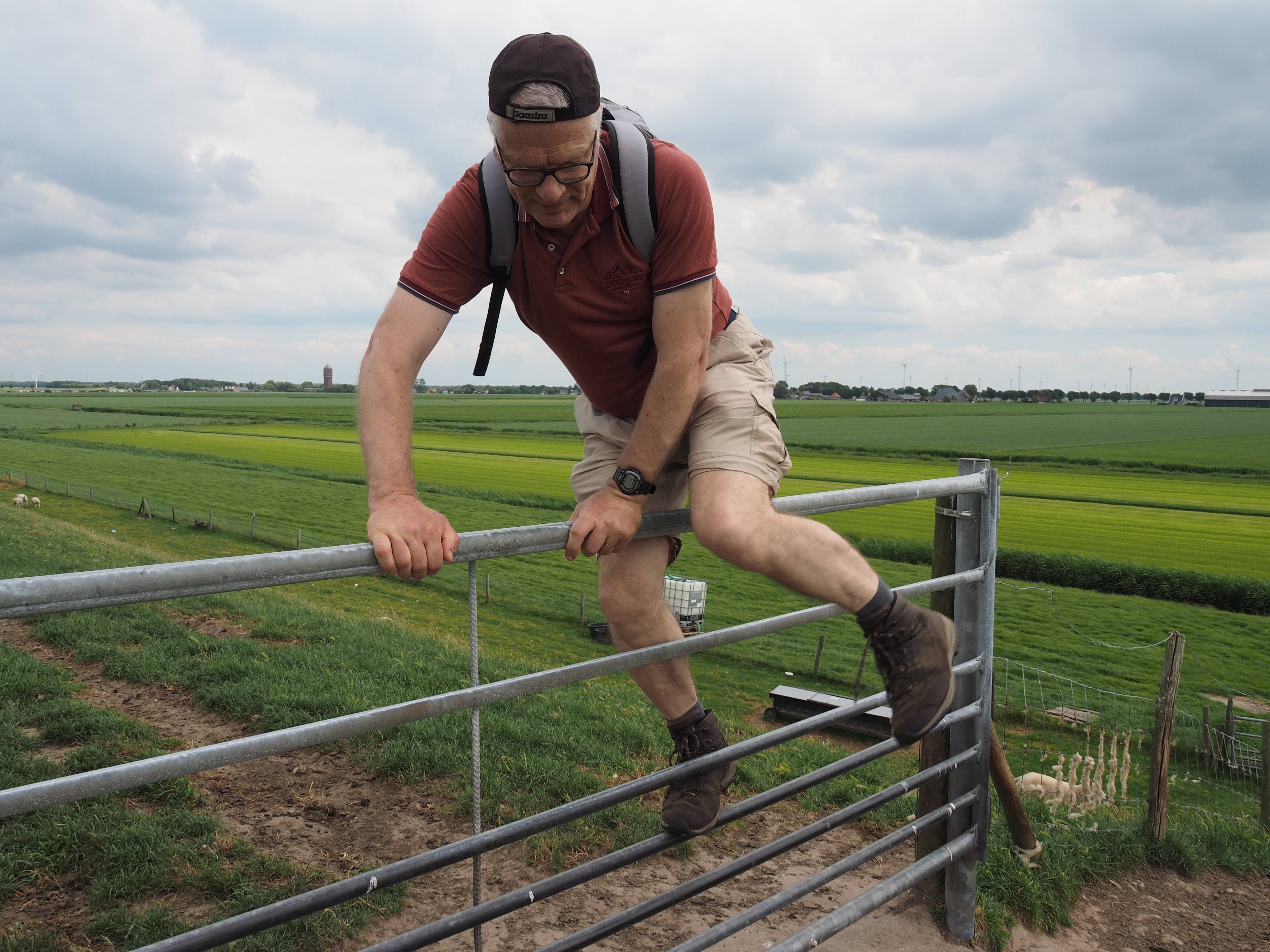 We klimmen over een volgend hekje. Halverwege wordt ons pad geblokkeerd door een kudde schapen. Rustig langslopen, er klinkt wat opstandig geblaat, maar verder geen probleem. Even verderop denken een aantal schapen daar anders over. Uiteindelijk besluit een schaap toch maar opzij te gaan voor ons en als één schaap over de dam is.