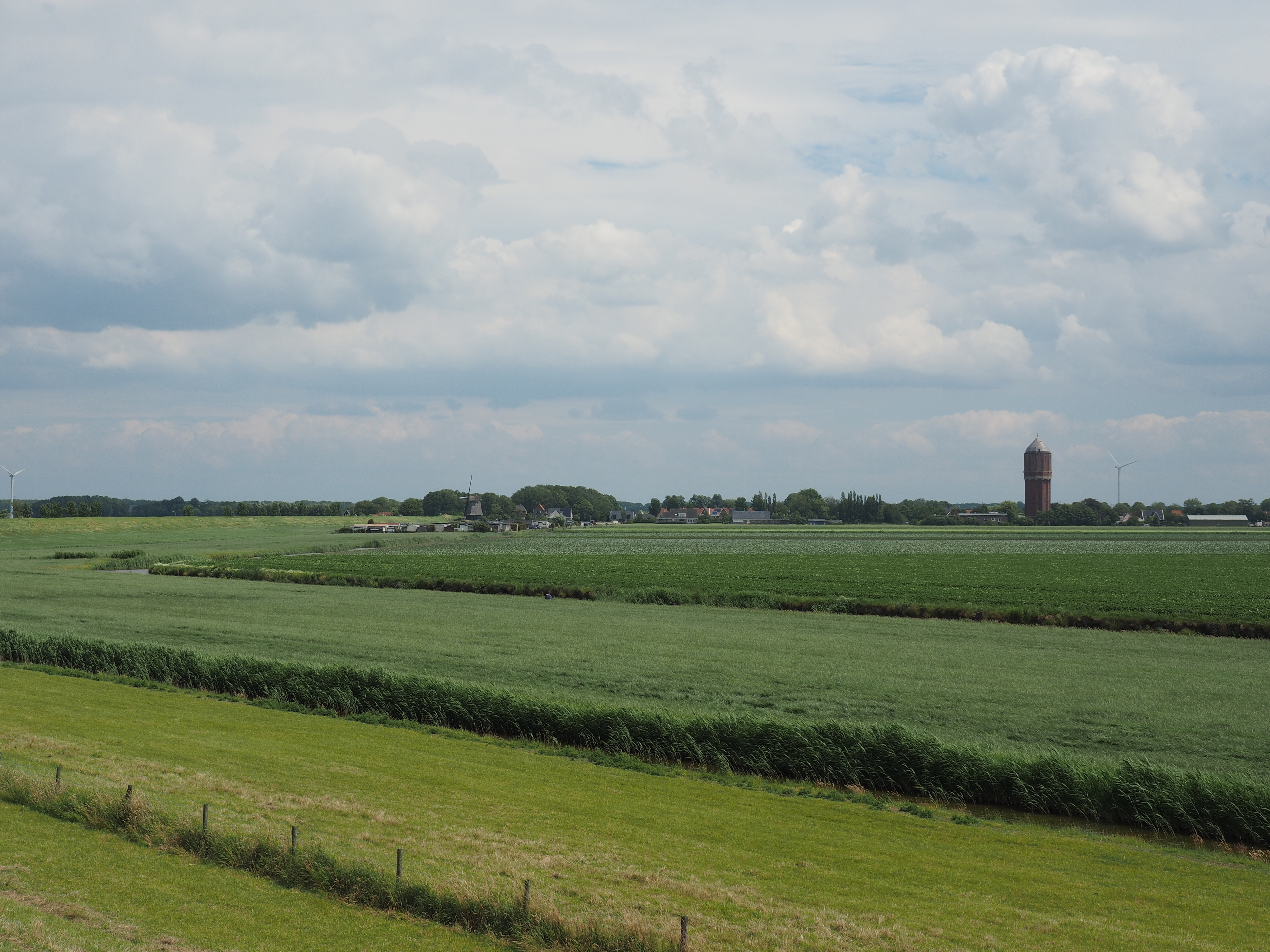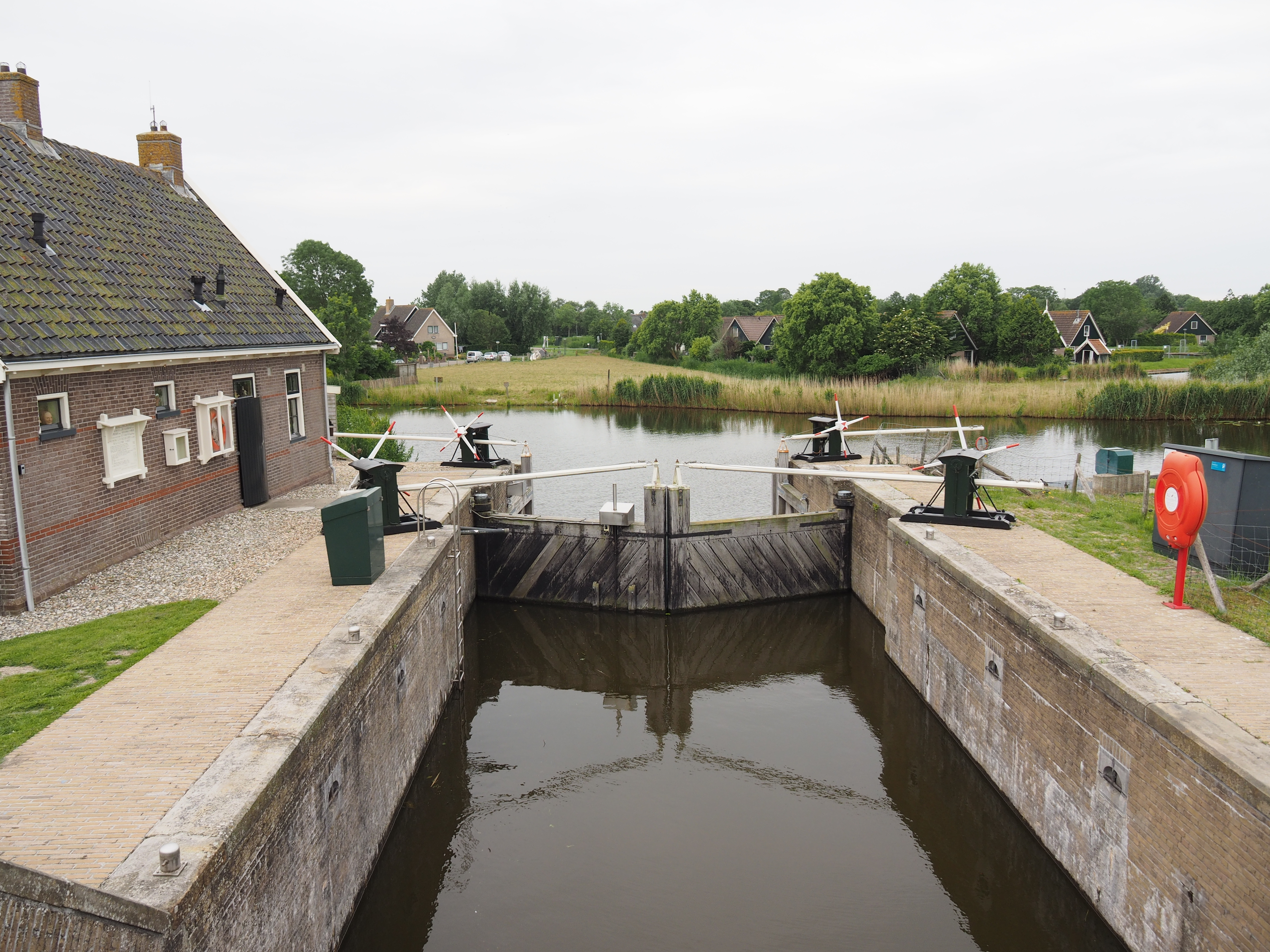 Wie zien in de verte de watertoren van Wieringen al liggen. Aan het eind van het pad niet richting Wieringen, maar naar Anna Paulowna. Van de grasdijk naar verharde weg. Het is even wennen. Voor de brug linksaf de Kneeskade op. Langs de Hooge Oude Veer weer richting Oudesluis. Aangekomen bij Oudesluis nog even de sluis bezichtigd.