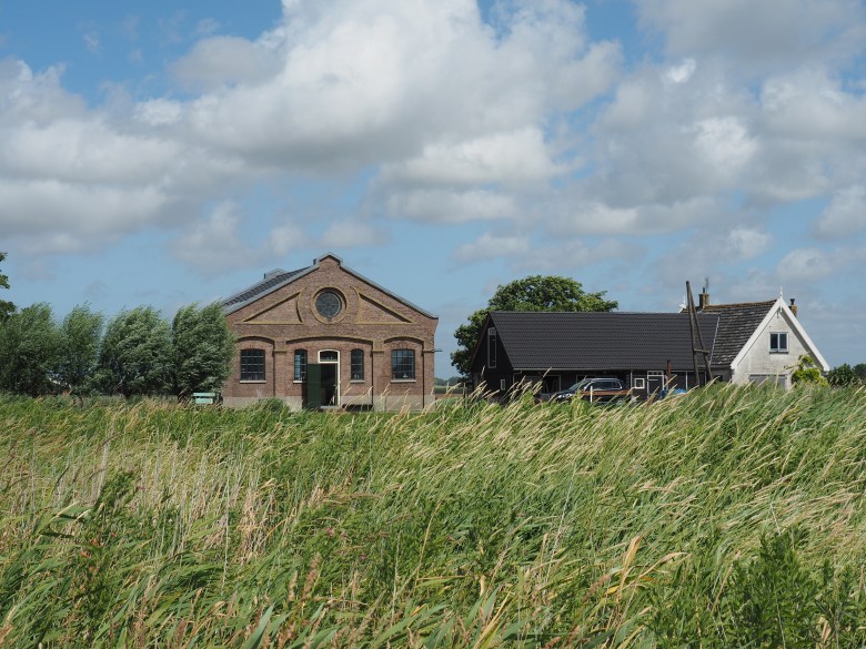 Het startpunt is bij het Meertje van Dirkshorn. Het waait flink. Langs het meer richting het gemaal, dat in het verleden de polder droog hield.
